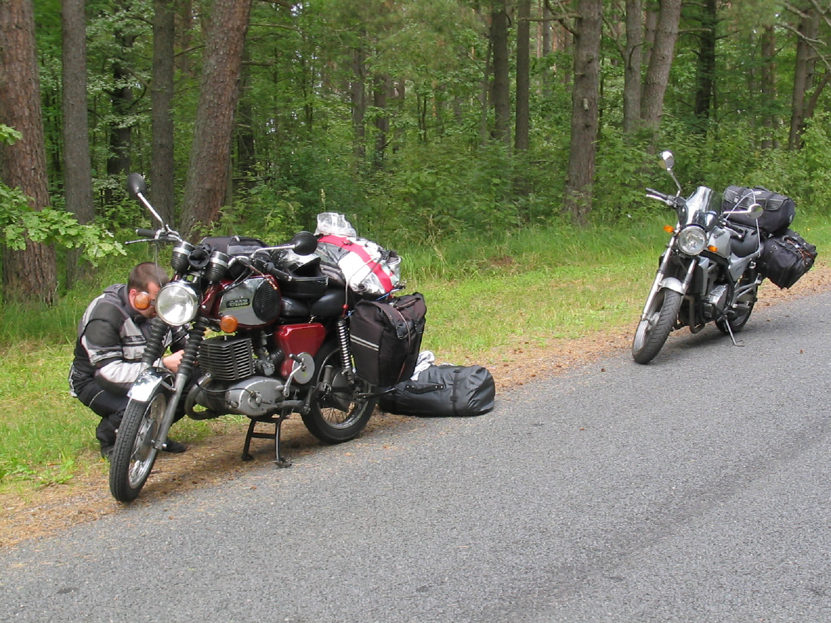 Der vorgesehene Campingplatz in Pärnu, war trotz abseitiger Lage, schnell und ohne Probleme gefunden. Die Tütensuppe bereiteten wir auf unserem Gaskocher zu und genossen die Abendsonne am gleichnamigen Fluß. An diesem fanden gerade Kanu Wettkämpfe statt, was sehr zu unserer Belustigung. beitrug, da plötzlich, eigentlich wenige Leute, einen Höllen- lärm verbreiteten, indem sie ihre Favoriten anfeuerten. Die Sanitären Anlagen dieses Platzes waren leider nicht sehr sauber und ausreichend. Aus diesem Grund wurde am nächsten morgen ein Cafe aufgesucht. Die vergangene Nacht war furchtbar kalt und ich habe schrecklich gefroren. Auch darum war ich froh einen heißen Kakao zu bekommen. Erst gegen Mittag brachen wir auf. Entlang der Ostseeküste ging es in Richtung Riga. Das Wetter zog sich zu und wir konnten nicht einmal baden gehen. Zudem war wohl heute Tag X nach Freitag dem 13.. Gar nicht weit von Pärnu entfernt, gab Peter mir Zeichen, dass es wohl Probleme mit seiner Maschine gäbe. Gut das wir gerade auf eine kleine Küstenstrasse abgebogen waren, auf der außer uns keiner weiter anzutreffen war. Die Lichtmaschine machte Probleme. Die Lösung des Problems gestaltete sich recht schwierig. Ohne spezial Werkzeug, welches wir natürlich nicht mit hatten, war die Sache nicht sehr Erfolg versprechend. Meine Laune sank auf den Nullpunkt. Ich hatte wenig Lust unsere Reise schon jetzt zu beenden. Zum Glück habe ich aber einen sehr handwerklich begabten Freund, der es schaffte das Problem tatsächlich zu beheben, leider schuf er dabei ein neues, was aber erst mal nicht relevant war. Die MZ lief wieder. Kaum waren wir fertig fing es an zu regnen.