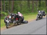 Unsere letzte Nacht in diesem Land wollten wir Nahe der Grenze zu Polen in Birstonas verbringen. Hier fanden aber gerade viele Konferenzen statt und meine Hoffnungen auf ein Zimmer schwanden schon dahin, doch im Sanatorium war noch etwas frei. Auch diesmal fragten wir, wie eigentlich in jeden Ort nach einem bewachten Parkplatz, doch auch diesmal nutzen wir ihn nicht, was uns fast zum Verhängnis geworden wäre. Wir erkundeten die schöne Gegend und nutzen das warme Wetter. Nach einer ruhigen Nacht kam das böse erwachen. Die Motorräder, die auf einem Parkplatz vor dem Sanatorium standen waren halb abgedeckt. Ich ging sofort hinunter um nach dem rechten zu schauen. Als ich allerdings mein Schloss aufschließen wollte musste ich feststellen, dass es nicht mehr da war. Peters hing auch nur noch am seidenem Faden. Ansonsten schien aber alles in Ordnung. Welch ein Glück, das wir nur dieses eine Mal wenigstens beide Bikes an den Vorderrädern zusammengeschlossen hatten. Das Frühstück wollte uns beiden nicht so recht schmecken und wir sahen nur zu das wir dort wegkamen. Nur für einen Tankstopp hielten wir kurz im Nachbarort und dann erst wieder in Polen.